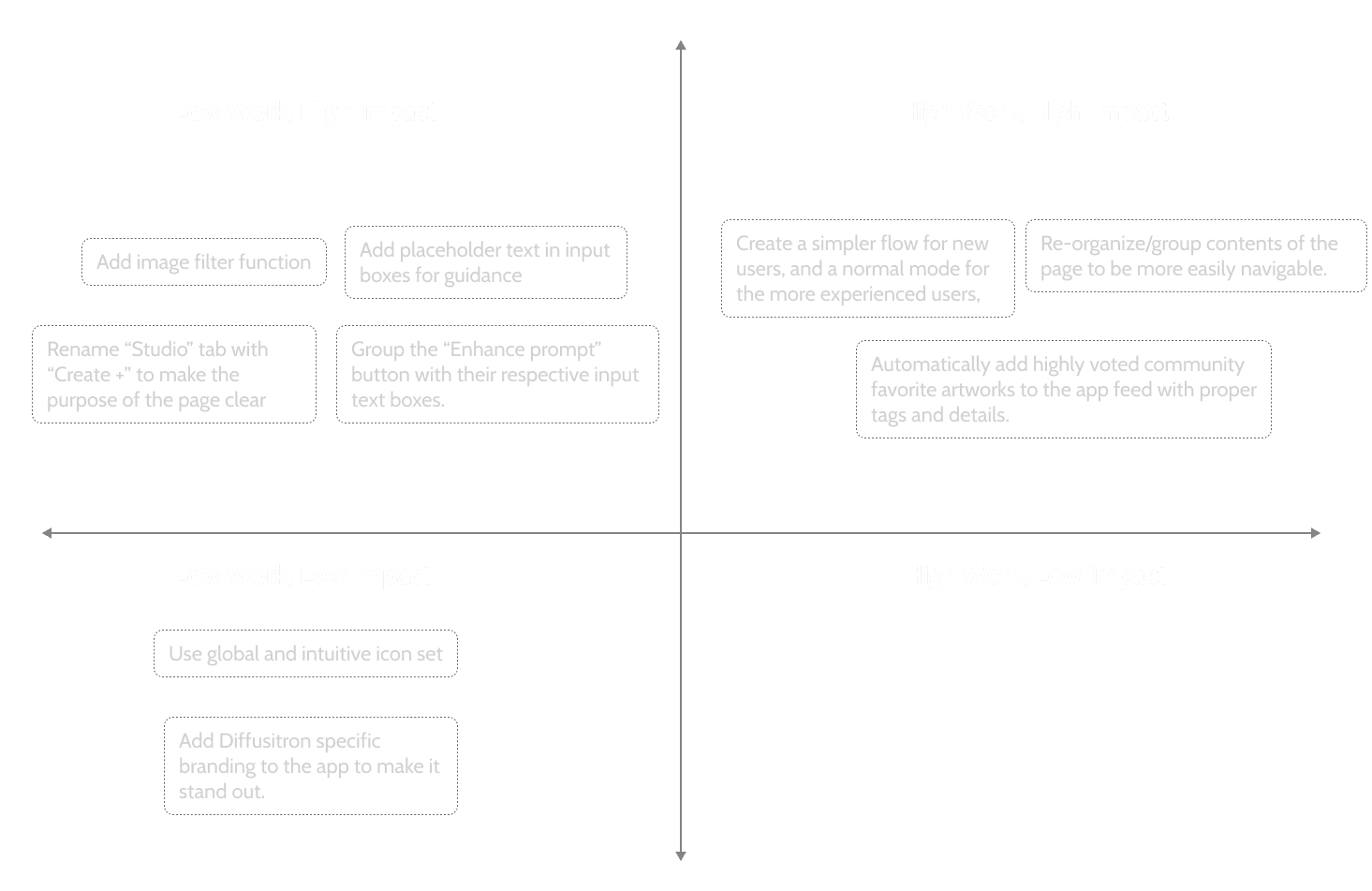 I condensed these findings into design opportunities, consulted the developer team for feasibility of implementation, and categorized them into a priority matrix based on the amount of engineering effort against its foreseeable impact.