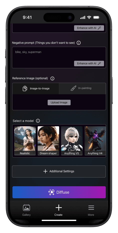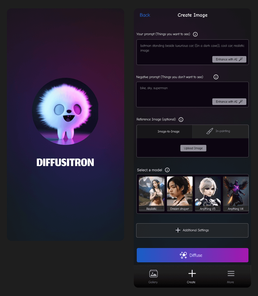Diffusitron is an AI image generator app made for iOS. It includes features like prompt-enhancement, image-to-image generations, inpainting, all by using natural language text prompt. With more than 1800 daily active users using this app, Diffusitron is one of the most popular AI art generation apps on the platform, with plans to expand as a content creation and sharing platform